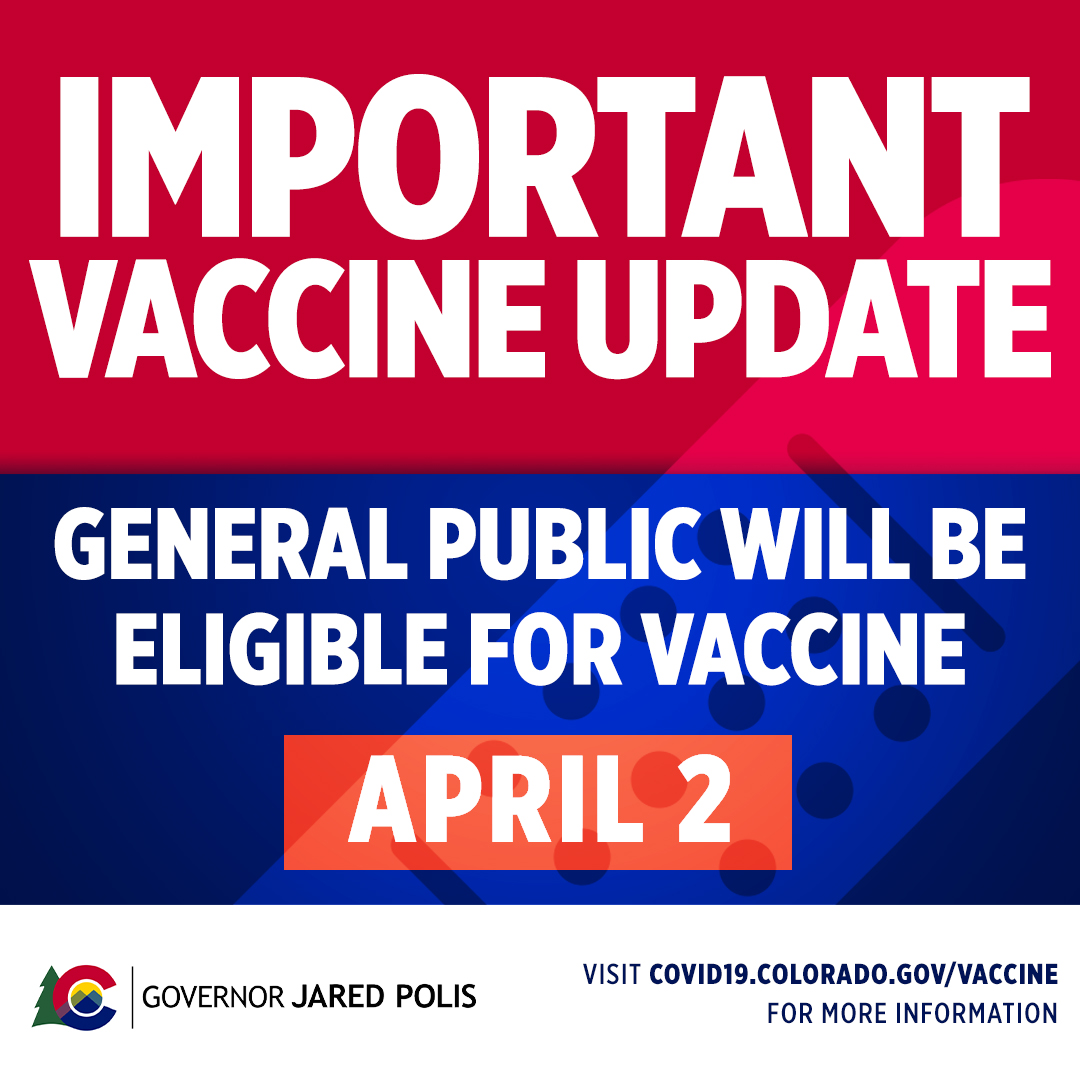 Governor Jared Polis On Twitter Covid 19 Vaccine Update Starting Friday April 2 All Coloradans 16 And Up Will Be Eligible To Receive The Pfizer Vaccine And Those 18 And Up Will Be
